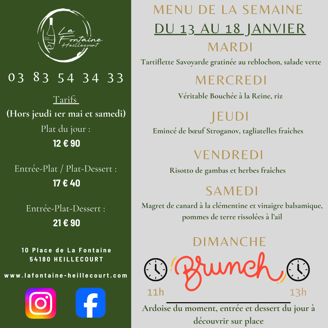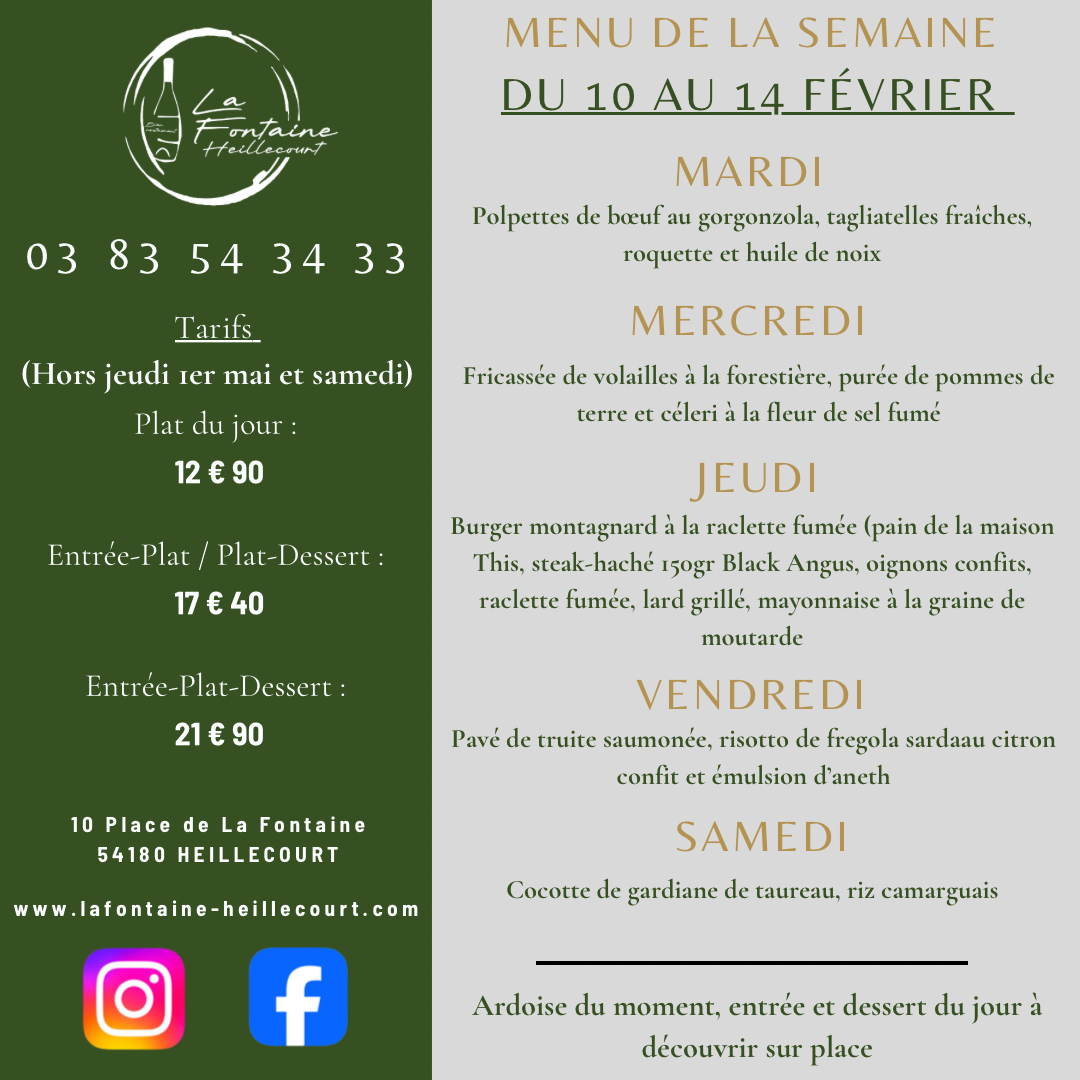 Chaque semaine, nous vous proposons un menu qui met à l’honneur les spécialités traditionnelles, préparées à partir de produits frais et de saison. Profitez de notre formule entrée + plat ou plat + dessert, ainsi que d’une offre trio entrée, plat et dessert pour une expérience gastronomique complète.